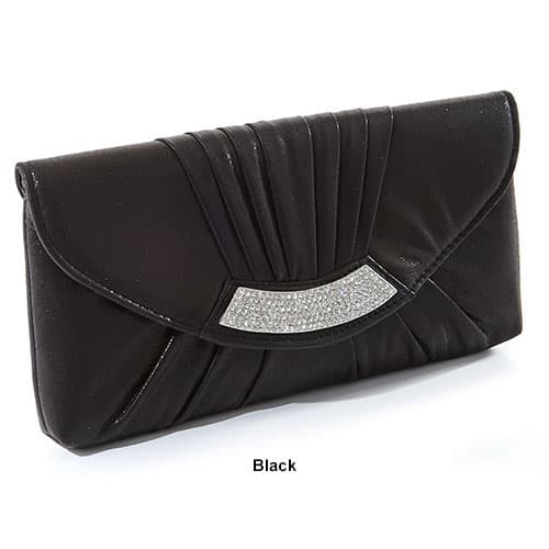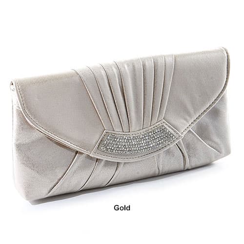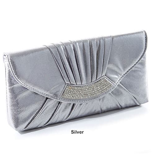 This luxurious and glamorous clutch bag is ideal to dress up any evening outfit for a night out on the town. The exterior features a soft shimmery shell with front rhinestone hardware and pleating for a delicate touch. The interior is fully lined with a back slip pocket and a flap with a metal snap closure. There is also a detachable chain crossbody strap.