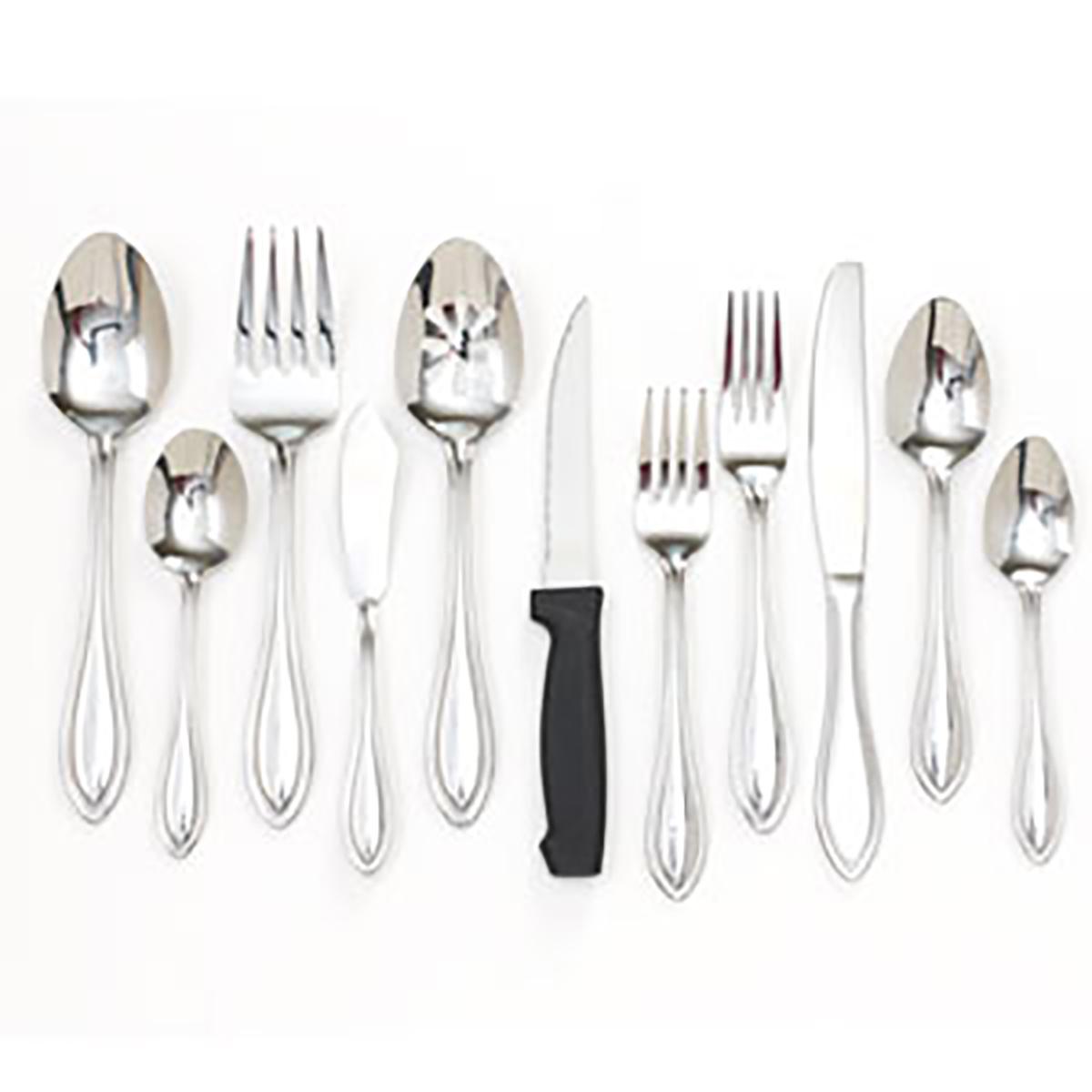 Classic meets modern in this American Bead 53 piece silverware set that features a teardrop shape with embossed bead chain border. Expertly-crafted from 18/0 stainless steel, this set is designed to complement any tabletop decor. 53 piece set, service for 8, includes 8 each: dinner fork, salad fork, dinner knife, dinner spoon, teaspoon and steak knife, plus a 5 piece serving set, which includes one each: sugar spoon, butter knife, tablespoon, pierced tablespoon, and cold meat fork. Dishwasher safe.This item requires oversize delivery. Please refer to the Order Summary in the Shipping step at checkout for delivery charge.