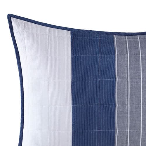 This Nautica Swale sham features a modern tailored look that will blend with any style. The pinstripe in grey and white reflects a classic menswear influence that is both casual and elegant in its simplicity. Channel stitch quilting complements and enhances the design while the deep blue binding edges add a clean and tailored finish.