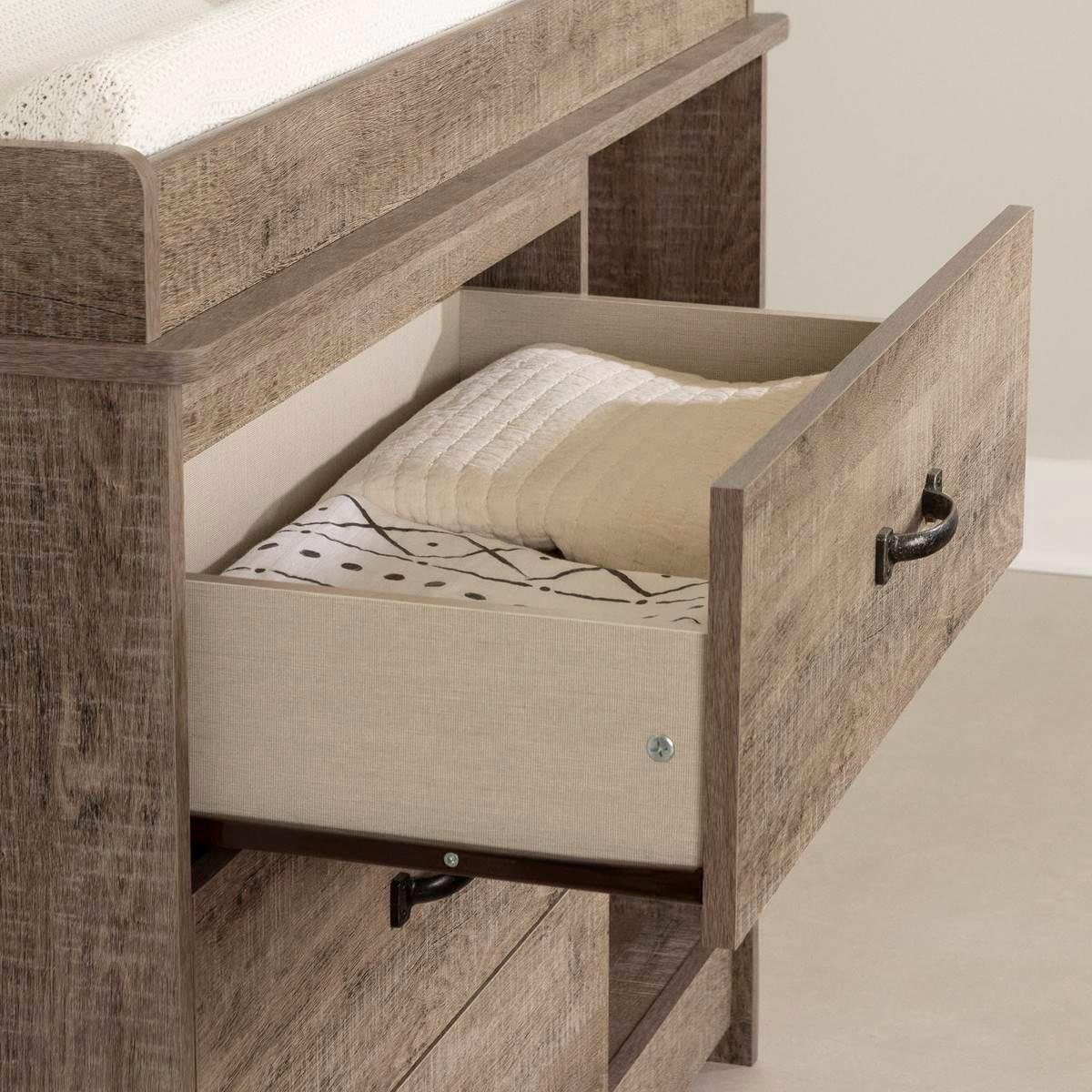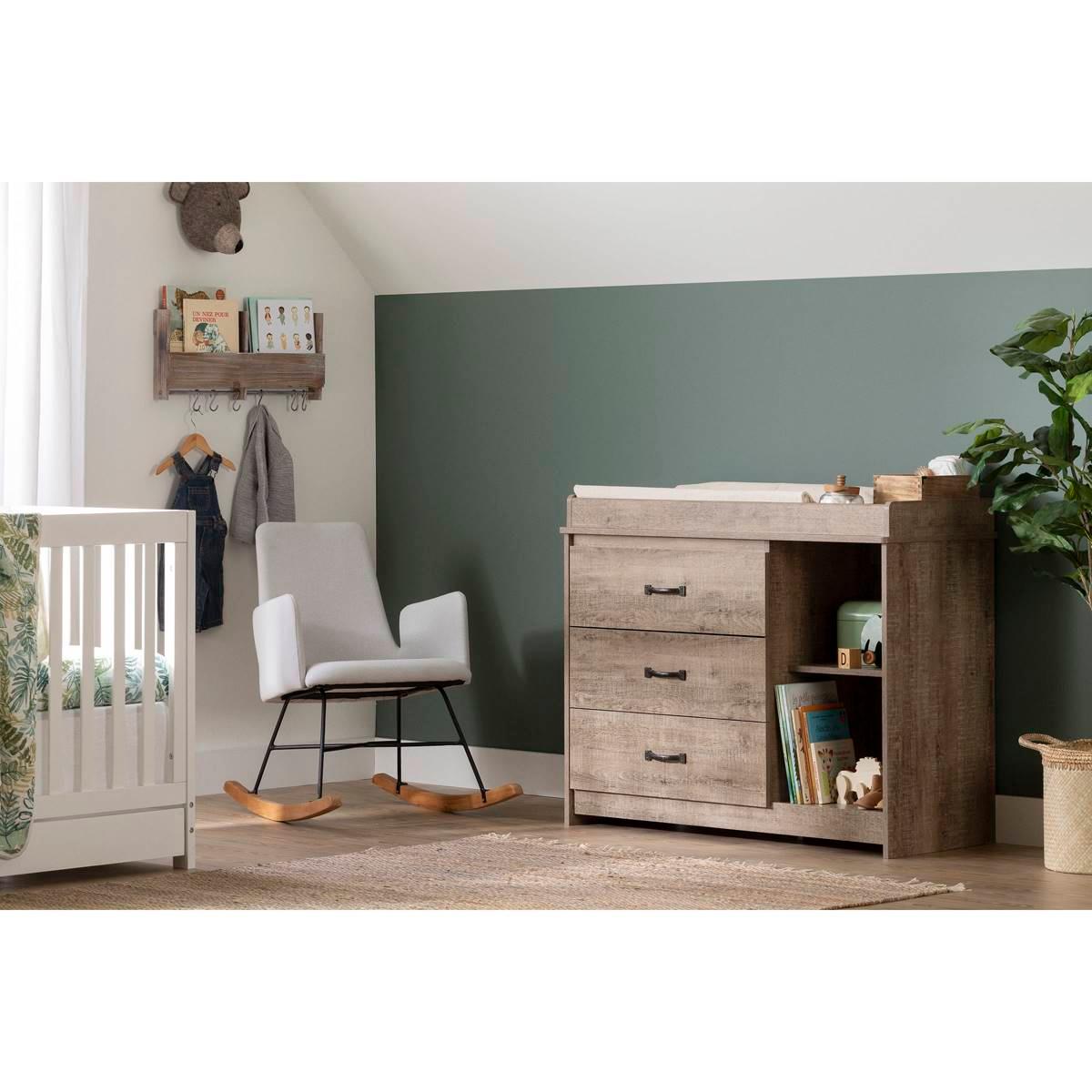Of course it´s important to set up the perfect little cocoon before baby arrives! Aside from meeting all your needs, this South Shore Tassio changing table will add that much sought-after rustic look to your newborn´s room. Its metal handles are very trendy, and they’ll add a charming, natural, soothing style to your decor. Three open spaces separated by two shelves (one adjustable) have been set up for the things you use often or want to keep close at hand, such as diapers. Pajamas, clothes, and blankets will find a home in one of the three large drawers.