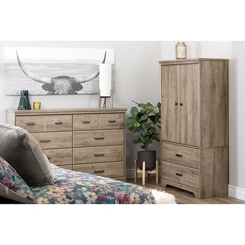 Description This South Shore Versa 2 door weathered oak armoire with drawers will be an attractive part of your home and jazz up your décor! This large, versatile piece will...