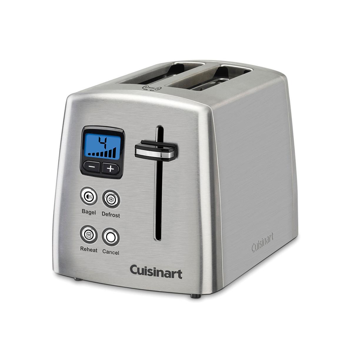 The stylish stainless steel 2-Slice countdown metal toaster by Cuisinart® takes toasting to a whole new level. Separate controls defrost waffles before toasting, reheat toast without more browning, and reduce heat on uncut side of bagels. Seven browning settings and self-adjusting slots mean thick and thin slices are toasted as desired. Blue backlit LCD countdown toasting-time bar display makes it easy to keep track. Perfect toast, English muffins, bagels, and more!