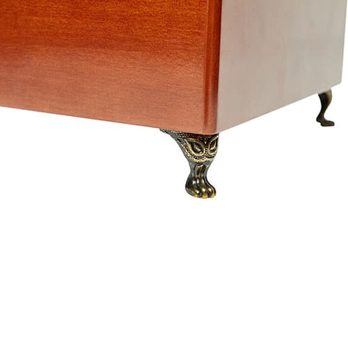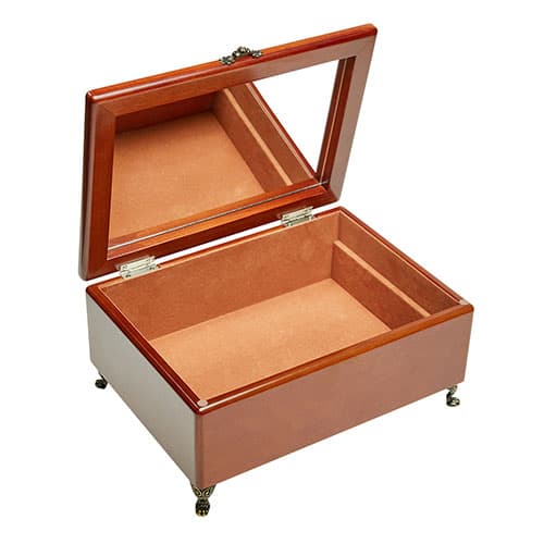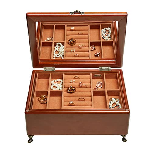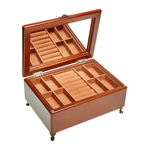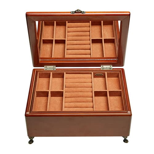 The Mele & Co. Kinsley wooden jewelry box features a lift lid with full interior mirror. The lift out tray displays 8 sections including ring rolls. The bottom compartment offers open area storage. Hand lined in ginger suede fabric and accented with antique decorative gold tone feet and lid lift. A Mele & Co. logo plate is displayed inside.