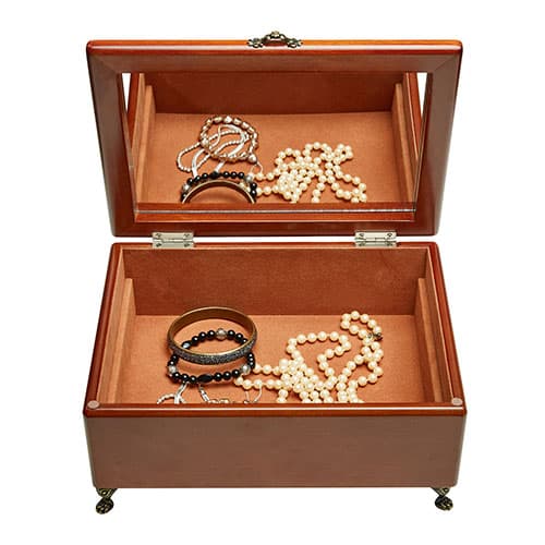 Description The Mele & Co. Kinsley wooden jewelry box features a lift lid with full interior mirror. The lift out tray displays 8 sections including ring rolls. The bottom...