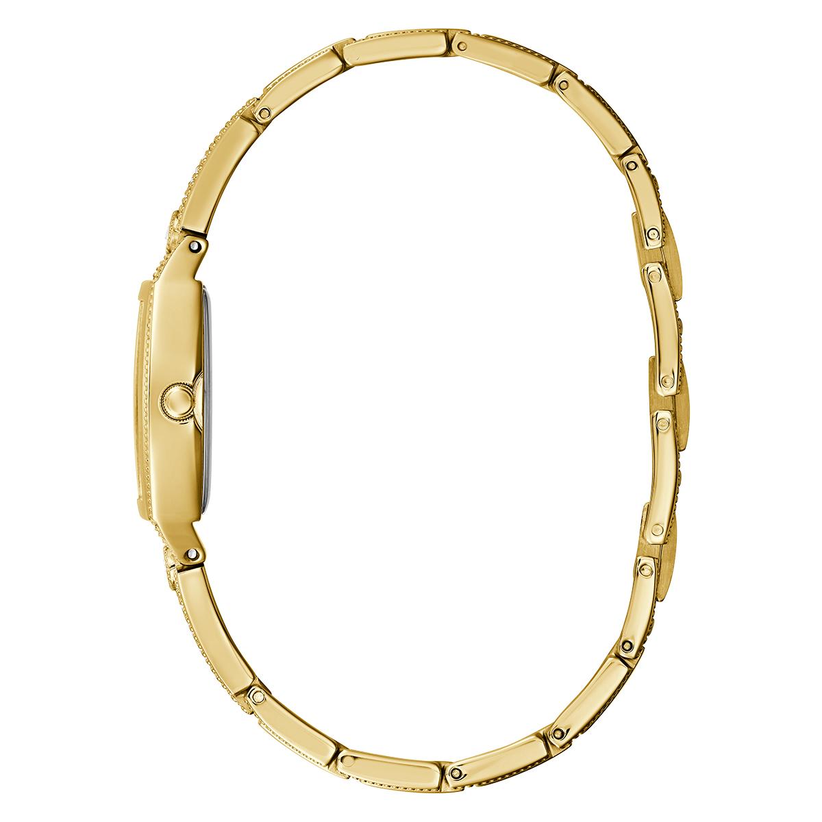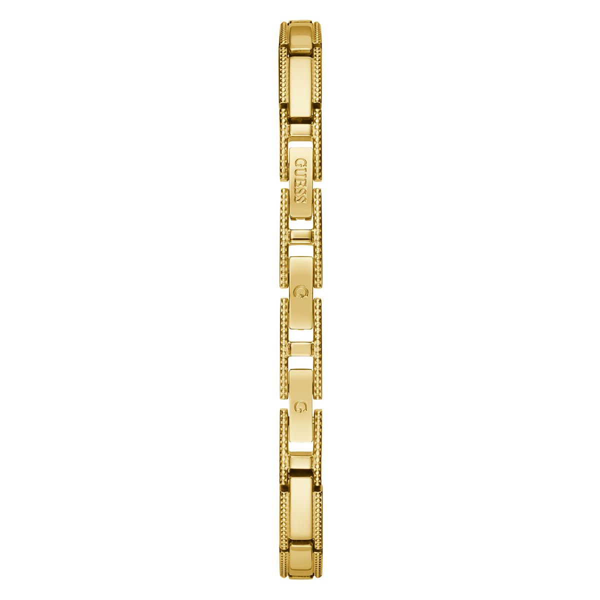 This Womens Guess deco-inspired jewelry bangle watch is the perfect layering piece. This watch features crystal and beading details and self-adjustable g links for easy sizing. Polished gold-tone stainless steel 23mm x 21mm case and bracelet. Analog function with a secondhand sweep.Limited Manufacturer´s Warranty.
