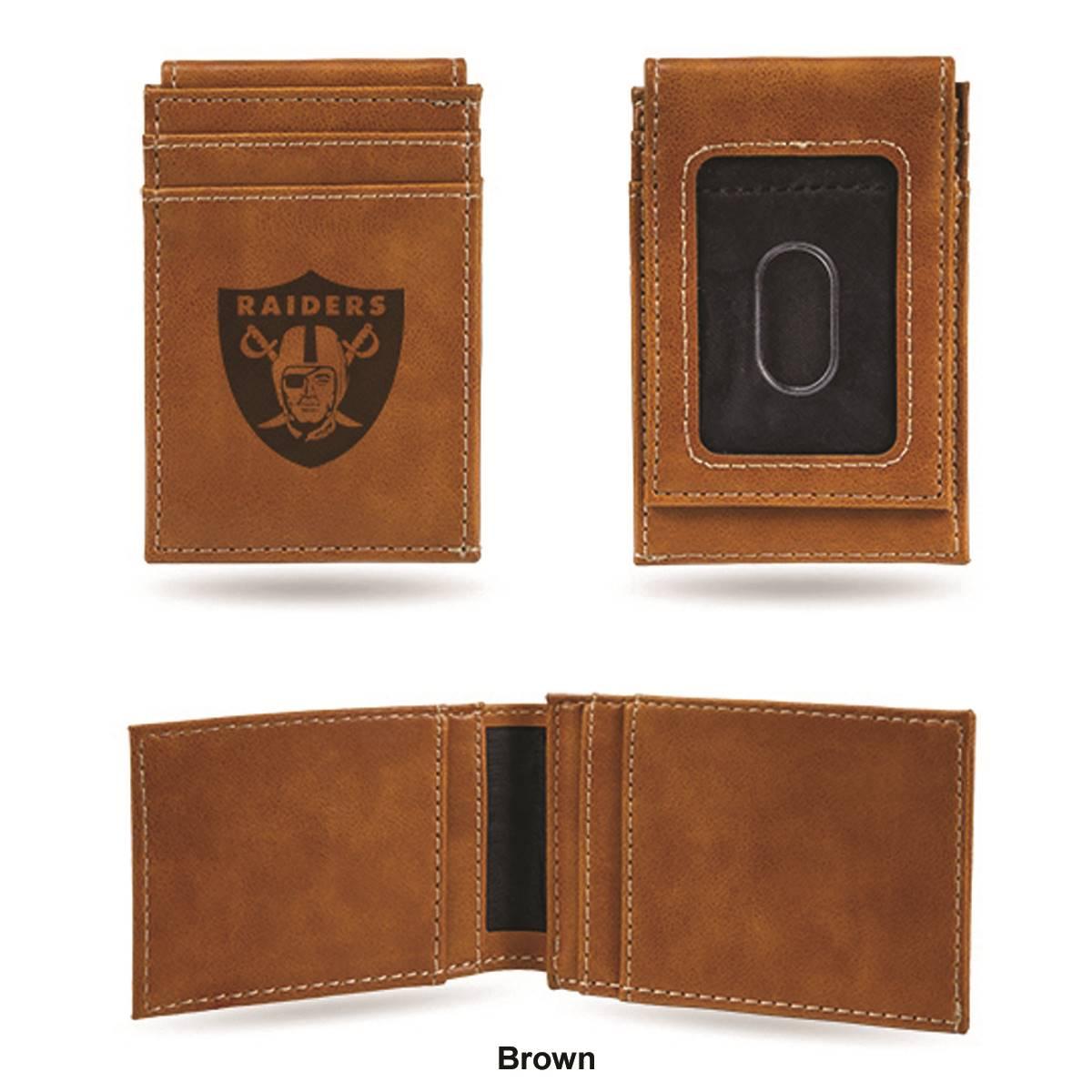 Put your money where your fandom is with this cool Mens NFL Las Vegas Raiders front pocket wallet. Made from faux leather, the 4-inch long and 2.75-inch wide wallet has an Oakland Raiders embossed logo with an ID window on the front and card slots. Show your love for your favorite team with this front pocket wallet.