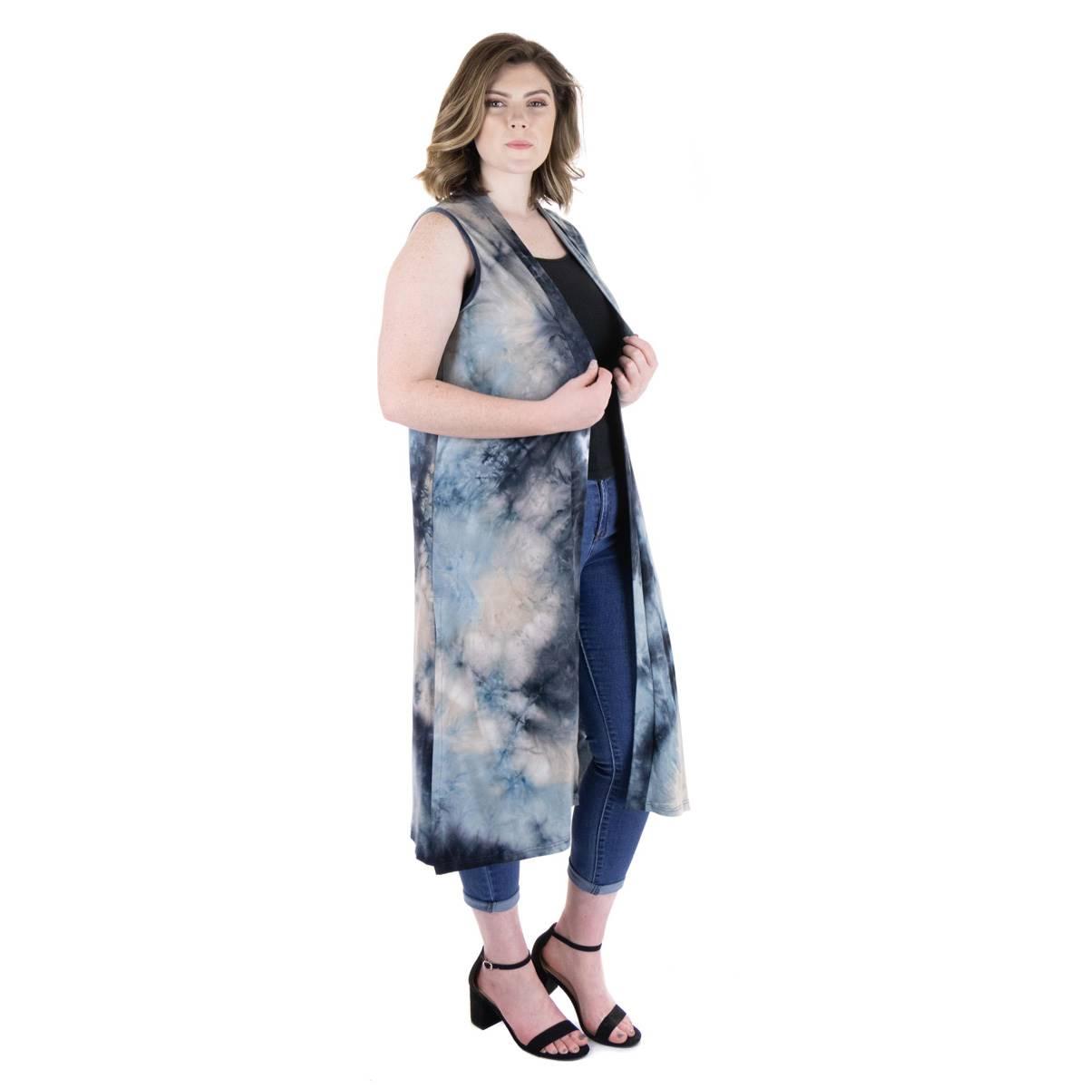 This Plus Size 24/7 Comfort Apparel sleeveless cardigan is an easy stylish add on to any outfit. Featuring a modern sleeveless cut, and an open front design, and is made in a fun tie dye print. Pair this lightweight cardigan with a cami and shorts for an easy casual look or style it with jeans and heels for a sophisticated dressy look.